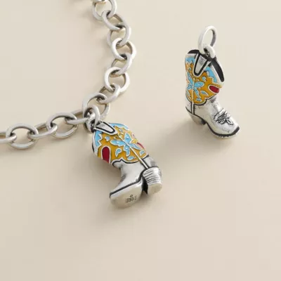 Highlighting the colors and patterns found on traditional western boots, the hand-painted enamel on this sterling silver charm depict colorful butterflies and hearts.