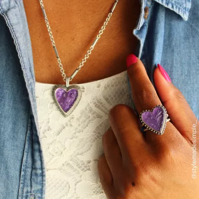 - Available in Three 20.1 x 18.6 x 4.5mm Heart-Shaped Tulip Carved Layered Gemstones: Purple Doublet (Lab-Created Amethyst and Mother of Pearl), White Doublet (Lab-Created Clear Quartz and Mother of Pearl) or Blue Triplet (Lab-Created Blue Spinel, Dyed Agate, and Mother of Pearl)
